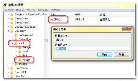 3、在shell鍵下新建一個(gè)Reset的子鍵。雙擊該鍵值,將數(shù)值數(shù)據(jù)設(shè)置為“重新啟動(dòng)”,點(diǎn)擊“確定”保存。