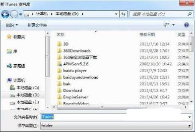 2、此時彈出一個新iTunes資料庫創建窗口,選擇需要創建的iTunes資料存放地方,比如D盤,文件夾名稱命名為“iTunes”,保存類型設為“folder”,然后點擊保存;