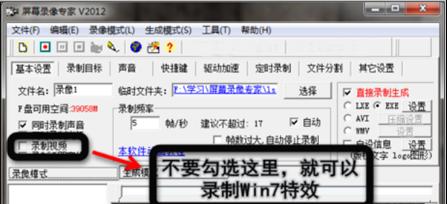 2、在軟件主界面上,默認(rèn)是開啟“錄制視頻”的,所以特效就不能錄制,將“錄制視頻”前面的鉤去掉,這樣就可以錄制WIN7特效了,非常簡單。