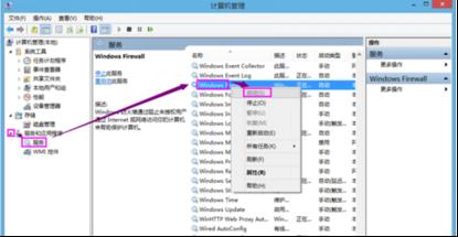 2、在彈出的管理界面,在服務(wù)和應(yīng)用程序下面的點(diǎn)擊“服務(wù)”選項(xiàng),在出現(xiàn)的右側(cè)服務(wù)列表中找到并右擊“windows firewall”,選擇“啟用”即可。