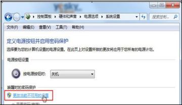 2、然后系統進入控制面板-硬件與聲音-電源選項-系統設置面板中,點擊“更改當前不可用的設置”。