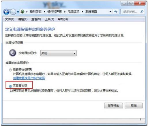 4、此時“喚醒時的密碼保護”下面設置狀態變為可設置狀態,點選“不需要密碼”,然后按“保存修改”退出就OK了。