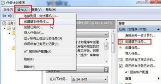 2.在Win7系統(tǒng)的“任務(wù)計(jì)劃程序”設(shè)置面板中,我們點(diǎn)擊菜單“操作—創(chuàng)建基本任務(wù)”。