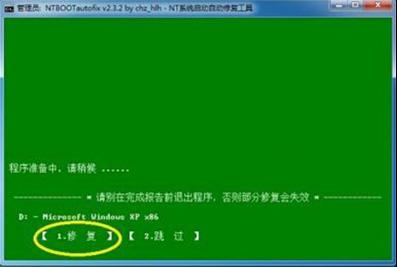 | Windows 7,中文名稱視窗7,是由微軟公司(Microsoft)開發的操作系統,內核版本號為Windows NT 6.1。Windows 7可供家庭及商業工作環境:筆記本電腦 、平板電腦 、多媒體中心等使用。Windows 7可供選擇的版本有:入門版(Starter)、家庭普通版(Home Basic)、家庭高級版(Home Premium)、專業版(Professional)、企業版(Enterprise)(非零售)、旗艦版(Ultimate)。 一些用戶在Windows7系統下安裝xp系統后,遇到了這樣一個問題,重啟后直接進入系統,沒有選擇啟動菜單,怎么解決呢?為了幫助用戶快速解決這個問題,現小編給大家介紹在系統之家windows7下安裝xp后重啟沒有選擇啟動菜單的應對手段,具體如下:一、準備工作: 下載NTBOOT2.5.7軟件 二、操作步驟: 1、在NTBOOT2.5.7版本軟件上右擊選擇以管理員身份打開,在打開的窗口中手動修復,在彈出提示修復windows xp x86啟動項,點擊“修復”項; 2、然后在跳到windows7 ultimate 啟動項窗口中選擇“跳過”項; 3、彈出的窗口界面中選擇跳過。 通過以上設置后,重新啟動系統后,就會出現選擇啟動菜單了。 windows 7 的設計主要圍繞五個重點——針對筆記本電腦的特有設計;基于應用服務的設計;用戶的個性化;視聽娛樂的優化;用戶易用性的新引擎。 跳躍列表,系統故障快速修復等,這些新功能令Windows 7成為最易用的Windows。 |