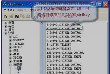 2、其命名規(guī)則是:“次鍵,編碼,virtkey,主鍵”,這里以“ctrl+x”更改為F10為例,給大家介紹具體修改方法,主鍵是指要先按住的鍵,即ctrl,次鍵則是第二個要按住的鍵,即x。那么就是將“ctrl+X”的值是“x,28696,virtkey,control”,修改成“F10,28696,virtkey”即可。