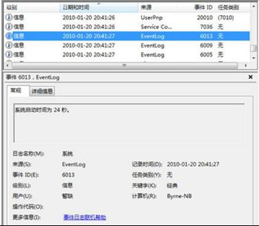 | Windows 7,中文名稱視窗7,是由微軟公司(Microsoft)開發(fā)的操作系統(tǒng),內(nèi)核版本號為Windows NT 6.1。Windows 7可供家庭及商業(yè)工作環(huán)境:筆記本電腦 、平板電腦 、多媒體中心等使用。Windows 7可供選擇的版本有:入門版(Starter)、家庭普通版(Home Basic)、家庭高級版(Home Premium)、專業(yè)版(Professional)、企業(yè)版(Enterprise)(非零售)、旗艦版(Ultimate)。 很多用戶發(fā)現(xiàn)使用Windows7系統(tǒng)的啟動速度要比xp慢很多,但也有用戶覺得啟動速度很快。其實,在Windows 7系統(tǒng)下可直接通過系統(tǒng)日志非常清楚地查看系統(tǒng)的啟動時間的,可幫助用戶詳細了解Windows 7系統(tǒng)的啟動時間,現(xiàn)筆者給大家介紹通過系統(tǒng)之家win7旗艦版 64系統(tǒng)日志查看系統(tǒng)啟動時間的技巧,具體如下:1、右擊 “計算機”選擇“管理”,打開“計算機管理”窗口。 2、在“計算機管理”窗口中依次選擇“系統(tǒng)工具→事件查看器→Windows日志→系統(tǒng)”。 3、在右側(cè)窗格中,根據(jù)顯示的時間(建議選擇間隔一天的事件)選擇一個事件,在下面的窗格中就可以查看到精確到秒的系統(tǒng)啟動時間。 另外,如果覺得手工定位比較麻煩的話,還可以對“來源”進行排序,這樣不僅可以查看系統(tǒng)的啟動時間,還可以比較在一段時間內(nèi)的系統(tǒng)啟動速度快慢。 windows 7 的設(shè)計主要圍繞五個重點——針對筆記本電腦的特有設(shè)計;基于應(yīng)用服務(wù)的設(shè)計;用戶的個性化;視聽娛樂的優(yōu)化;用戶易用性的新引擎。 跳躍列表,系統(tǒng)故障快速修復(fù)等,這些新功能令Windows 7成為最易用的Windows。 |
