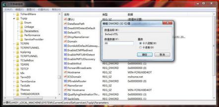 2、在注冊表編輯器中定位到HKEY_LOCAL_MACHINE\SYSTEM\CurrentControlSet\Services\Tcpip\Parameters,選擇DefaultTTL,將值改為80(16進(jìn)制)。