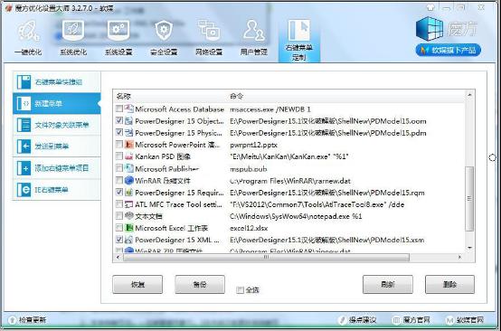| Windows 7,中文名稱視窗7,是由微軟公司(Microsoft)開發(fā)的操作系統(tǒng),內(nèi)核版本號為Windows NT 6.1。Windows 7可供家庭及商業(yè)工作環(huán)境:筆記本電腦 、平板電腦 、多媒體中心等使用。Windows 7可供選擇的版本有:入門版(Starter)、家庭普通版(Home Basic)、家庭高級版(Home Premium)、專業(yè)版(Professional)、企業(yè)版(Enterprise)(非零售)、旗艦版(Ultimate)。 有用戶反饋在Win7中安裝了Powe Designer后,右鍵新建菜單中出現(xiàn)了很多和power designer有關(guān)的文件,導(dǎo)致右鍵菜單太亂,這樣無疑使用右鍵新建菜單時帶來查找麻煩,想將power designer有關(guān)的右鍵菜單刪除掉,如何操作?現(xiàn)筆者教你如何清除系統(tǒng)之家win7旗艦版gho系統(tǒng)中多余的桌面右鍵“新建”菜單,大家一起來看看吧。 1、下載并安裝魔方優(yōu)化設(shè)置大師。 2、打開魔方,在魔方優(yōu)化設(shè)置大師界面中選擇右上角的“右鍵菜單定制” 3、然后將需要刪除的文件勾選后,點擊刪除就OK了。 windows 7 的設(shè)計主要圍繞五個重點——針對筆記本電腦的特有設(shè)計;基于應(yīng)用服務(wù)的設(shè)計;用戶的個性化;視聽娛樂的優(yōu)化;用戶易用性的新引擎。 跳躍列表,系統(tǒng)故障快速修復(fù)等,這些新功能令Windows 7成為最易用的Windows。 |