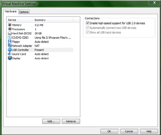 1、運(yùn)行虛擬機(jī),依次點(diǎn)擊查看“工具欄--VM--“Settings--Hardware”,檢查“Device”欄目中有無(wú)“USB Controller”,如果沒(méi)有ADD的話,就添加一個(gè),有的話就繼續(xù)點(diǎn)擊它,然后查看右邊是否全部都已經(jīng)勾選。