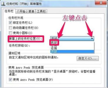 2、在打開的“任務(wù)欄和開始菜單屬性”窗口中,任務(wù)欄標(biāo)簽頁中點(diǎn)擊“屏幕上的任務(wù)欄位置(T)”后面方框內(nèi)的小三角,在彈出的下拉菜單中點(diǎn)擊底部,再點(diǎn)擊“應(yīng)用——確定”即可。