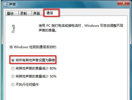 2、在打開的聲音窗口中,切換到“通信”標(biāo)簽頁,用戶可根據(jù)自己的需要來點(diǎn)選“將所有其他聲音設(shè)置為靜音”或者“將其他聲音的音量減少80%”或者“將其他聲音的音量減少50%”,點(diǎn)選完畢后點(diǎn)擊“確定”保存即可。