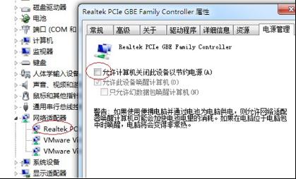 3、在打開網(wǎng)卡屬性中,切換到“電源管理”選項,將原來默認勾選的“允許計算機關(guān)閉此設(shè)備以節(jié)約電源”前面的選勾去掉。