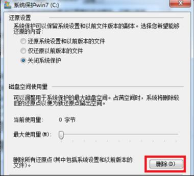 4、選擇“關閉系統(tǒng)保護”,選擇“刪除所有還原點”處的“刪除”按鈕便可擴大系統(tǒng)盤的空間