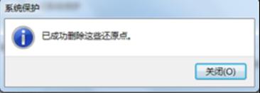 6、刪除成功后,系統(tǒng)會彈出系統(tǒng)保護已成功刪除的提示,點擊關閉,重啟計算機,此時你就會發(fā)現(xiàn)系統(tǒng)盤已騰出來了很多內存。