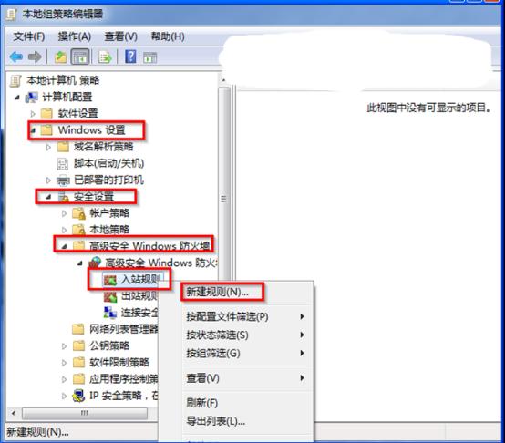 2、在打開的組策略編輯器中依次點(diǎn)擊“計(jì)算機(jī)配置”——“Windows設(shè)置”——“安全設(shè)置”——“高級(jí)安全Windows防火墻”——“高級(jí)安全Windows防火墻——本地組策略對(duì)象”——“入站規(guī)則”——“新建規(guī)則”。