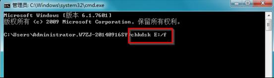 2、在打開(kāi)的命令提示符窗口中,輸入chkdsk E:/f,并按回車鍵。