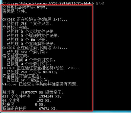 PS:若用戶需要找回的簇,磁盤正被使用時(shí),是不能執(zhí)行上述操作的,在出現(xiàn)的提示信息后輸入“Y”強(qiáng)制卸除該卷,并按回車鍵,此時(shí)將會(huì)自動(dòng)開(kāi)始校驗(yàn)文件和文件夾,校驗(yàn)完成后,便可查看相關(guān)結(jié)果了。