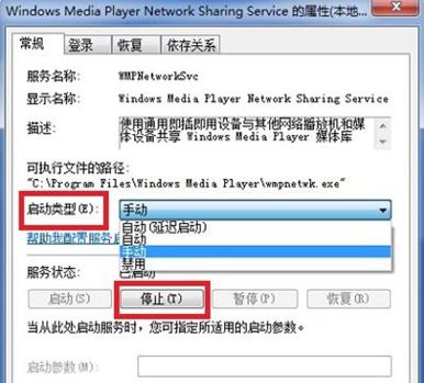 5、在打開的“Windows Media Player Network Sharing Service屬性”界面中,將啟動類型修改成“手動”,服務(wù)狀態(tài)修改成“停止”,點擊“確定”保存后退出。