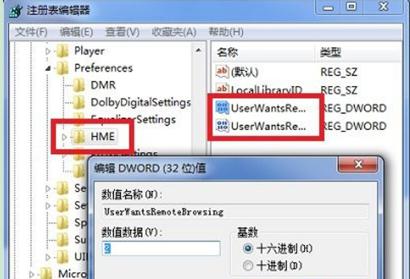 8、點擊HME項,然后在右側(cè)窗口分別雙擊字符串值UserWantsRemoteBrowsing及UserWantsRemoteSharing,將數(shù)值數(shù)據(jù)修改成2(十六進制),保存后退出注冊表即可。