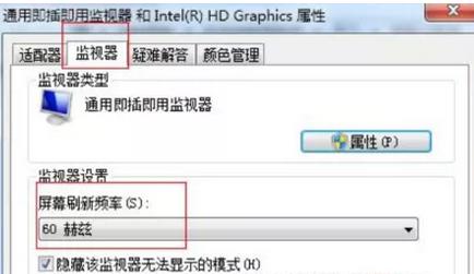 2、在彈出來的窗口中,切換到“監(jiān)視器”標(biāo)簽頁,可以看到顯示器的刷新頻率設(shè)置為“60”,這正是造成顯示器屏幕不斷抖動的原因。就將頻率設(shè)置為“75”以上,再點擊確定保存即可。