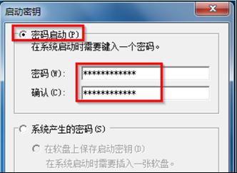 3、在出現(xiàn)的“啟動密鑰”窗口中,點選“密碼啟動(P)”,在“密碼”和“確認(rèn)”輸入框中輸入系統(tǒng)啟動密碼,輸完后點擊“確定”按鈕保存。