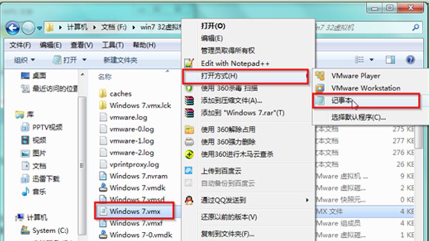 2、虛擬機文件夾中找到后綴為.vmx的文件,然后在.vmx文件上右鍵選擇“打開方式——記事本”。