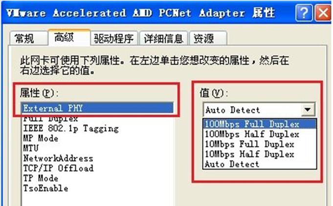 4、在打開的窗口中,切換到“高級”選項卡,找到external PHY,對網絡速度進行修改即可。