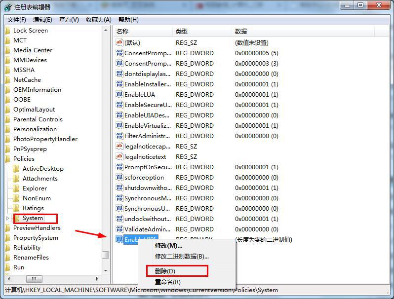 3、在右側(cè)窗口中找到并右鍵“EnableUIPI”,選擇“刪除”。