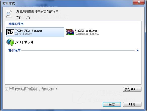 5、在打開(kāi)方式里選擇打開(kāi)的程序,比如7-Zip,如果沒(méi)有可通過(guò)下面的瀏覽來(lái)查找,然后確定即可