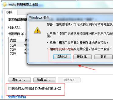 5、在打開的“hosts的高級(jí)安全設(shè)置”窗口中,去除勾選“包括可從該對(duì)像的父項(xiàng)繼承的權(quán)限”,彈出“Windows 安全”窗口,單擊添加按鈕。