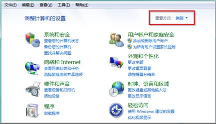 2、在打開的控制面板窗口中,點擊窗口右側的“查看方式”旁邊的下拉按鈕,可看到有三個選項,分別為“類別”、“大圖標”、“小圖標”,可以按照自己喜好選擇想要的顯示方式。