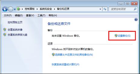 2、在打開的系統(tǒng)備份和還原控制面板中可看到, 這里集成了系統(tǒng)備份和還原的所有功能,但是并沒有開啟,點擊“設置備份”。