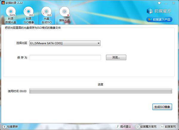 2、選擇“光盤生成ISO”選項(xiàng)卡,然后選擇插入了Win7系統(tǒng)光盤的光驅(qū)(一般都只有一個(gè)光驅(qū),無需選擇),再選擇保存的位置。然后點(diǎn)擊“生成ISO鏡像”
