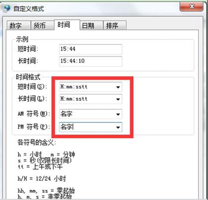 4、修改短時間和長時間為“H:mm:sstt”然后再AM符號和PM符號后面填寫你想顯示的名字(最好在三個字以內(nèi),避免顯示不全)點擊確定完成操作。