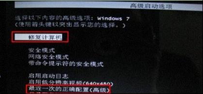 2、重新啟動win7系統(tǒng)并按F8鍵進入系統(tǒng)高級選項的模式,選中最近一次正確配置恢復的系統(tǒng)。