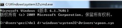 4、如果還是進不了的話,那么進入帶命令顯示符的安全模式下,在命令顯示符中給鍵入del X:\windows\system32\Drivers\spoon.sys 的命令進行刪除報錯文件了。