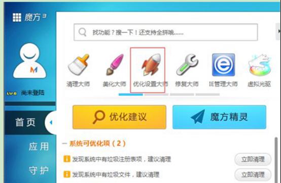 2、安裝完成后打開魔方優(yōu)化大師,點(diǎn)擊的“優(yōu)化設(shè)置大師”。