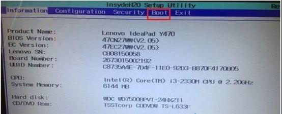 2、出現(xiàn)BIOS界面。若沒有出現(xiàn)該界面,請重新啟動計算機繼續(xù)按第一步驟的操作。在出現(xiàn)的BIOS界面中按左右鍵選擇“Boot”項。