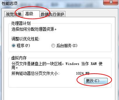 3、單擊“更改”按鈕彈出“性能選項(xiàng)”窗口,切換“高級(jí)”標(biāo)簽頁(yè),在“虛擬內(nèi)存”選項(xiàng)區(qū)中單擊“更改”按鈕。