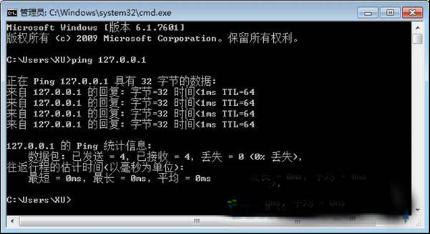 2.在命令提示符窗口,輸入“ping 127.0.0.1”命令后執(zhí)行,觀察網(wǎng)卡能否轉(zhuǎn)發(fā)數(shù)據(jù),當(dāng)連續(xù)出現(xiàn)“Reply from 127.0.0.1:bytes=32 time<1msTTL=128”,則說(shuō)明網(wǎng)絡(luò)網(wǎng)卡配置正確,如果連續(xù)出現(xiàn)“Request timed out”,則說(shuō)明網(wǎng)絡(luò)配置錯(cuò)誤或網(wǎng)絡(luò)有故障。