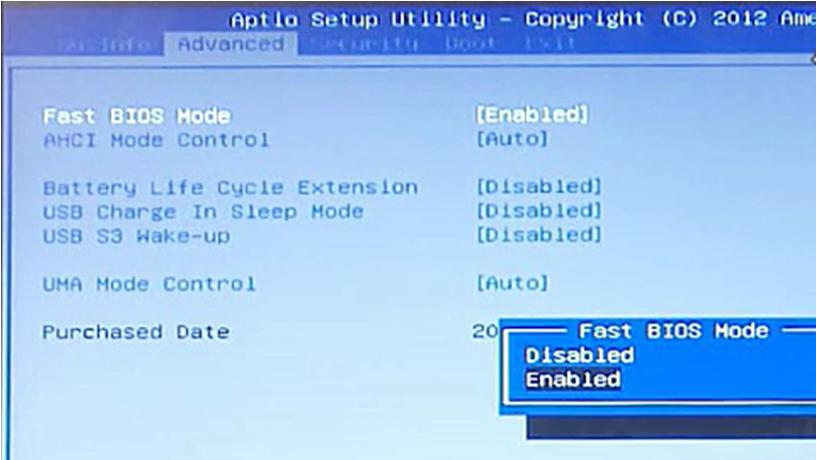3、在Advanced選項(xiàng)中選擇Fast BIOS Mode 將這個(gè)選項(xiàng)選擇成Disabled。