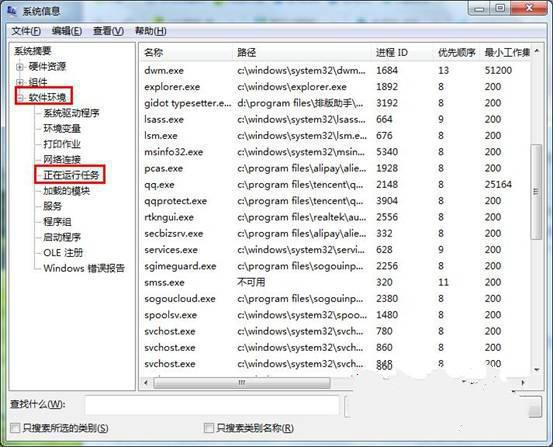 2、此時就會彈出一個系統(tǒng)信息的窗口,選擇“系統(tǒng)摘要—軟件環(huán)境—正在運行任務(wù)”然后就能夠在右邊的框里面顯示出來目前系統(tǒng)正在運行的全部程序的有關(guān)信息了,還包括有優(yōu)先順序和最小工作集等。
