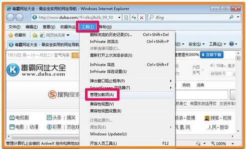 1、打開IE,點擊“工具——管理加載項(A)”。