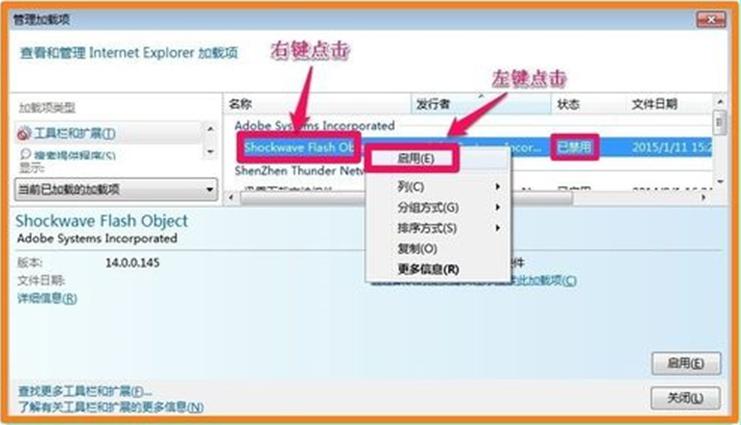 3、在管理加載項窗口,在Shockwave Flash Object右鍵選擇啟用。點擊“關閉”退出管理加載項即可。