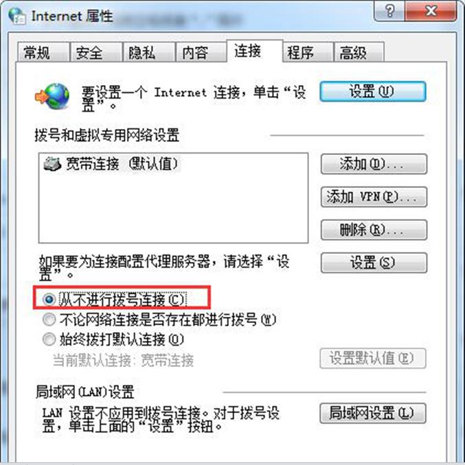 | Windows 7,中文名稱視窗7,是由微軟公司(Microsoft)開(kāi)發(fā)的操作系統(tǒng),內(nèi)核版本號(hào)為Windows NT 6.1。Windows 7可供家庭及商業(yè)工作環(huán)境:筆記本電腦 、平板電腦 、多媒體中心等使用。Windows 7可供選擇的版本有:入門版(Starter)、家庭普通版(Home Basic)、家庭高級(jí)版(Home Premium)、專業(yè)版(Professional)、企業(yè)版(Enterprise)(非零售)、旗艦版(Ultimate)。 有一朋友新購(gòu)了Win7系統(tǒng)電腦,一打開(kāi)網(wǎng)頁(yè)就彈出寬帶連接的窗口,很是煩人,有時(shí)候想自己手功能進(jìn)行寬帶連接,怎樣取消這個(gè)窗口提示呢?其實(shí)這是由于商家為了一些用戶方便設(shè)置的,如果用戶想取消的話,請(qǐng)來(lái)看看禁止電腦公司Win7系統(tǒng)打開(kāi)網(wǎng)頁(yè)彈出寬帶連接提示的方法吧。何取消這個(gè)設(shè)置呢? 操作步驟: 1、打開(kāi)IE瀏覽器,點(diǎn)擊“工具——Internet選項(xiàng)”。 2、在打開(kāi)的Internet選項(xiàng)后,點(diǎn)擊“連接”切換到連接設(shè)置界面,選擇“從不進(jìn)行撥號(hào)連接”選項(xiàng),然后確定。 ![]() 通過(guò)以上設(shè)置后,以后每次上網(wǎng)前就需要手動(dòng)連接寬帶,而不是一打開(kāi)IE瀏覽器就彈出連接窗口的提示了。 windows 7 的設(shè)計(jì)主要圍繞五個(gè)重點(diǎn)——針對(duì)筆記本電腦的特有設(shè)計(jì);基于應(yīng)用服務(wù)的設(shè)計(jì);用戶的個(gè)性化;視聽(tīng)娛樂(lè)的優(yōu)化;用戶易用性的新引擎。 跳躍列表,系統(tǒng)故障快速修復(fù)等,這些新功能令Windows 7成為最易用的Windows。 |