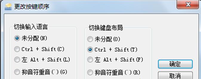 5、切換鍵盤布局標簽頁,選擇“Ctrl+Shift (T)”選項,其次點擊“確定”按鈕;