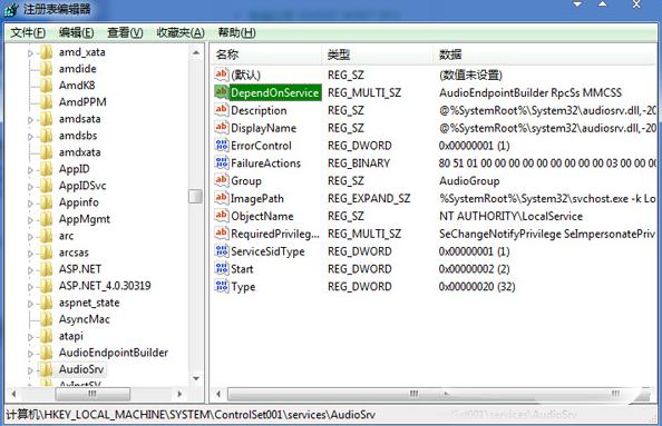 2、在打開的注冊表編輯器中,依次展開以下注冊項HKEY_LOCAL_MACHINE/SYSTEM/CurrentControlSet/Services/Audiosrv