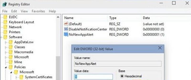 3、在右側(cè)窗口中創(chuàng)建一個DWORD 32位值,命名為NoNewAppAlert,將其數(shù)值數(shù)據(jù)設(shè)置為“1”。
