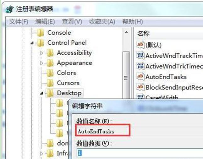 3、把這個名為AugoEndTasks的數值改為1。如果找不到AutoEndTasks,可自己新建一個然后修改為這個名字,數值設置為1即可。