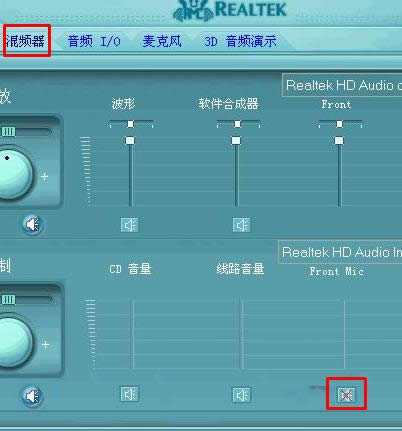 7、在打開的設(shè)置窗口中,選擇“混頻器”,如果發(fā)現(xiàn) "Front Mic"是靜音的。如果顯示紅色的小叉就表示是靜音狀態(tài),將"Front Mic"的紅色小叉去掉,然后點(diǎn)擊“OK”便可。